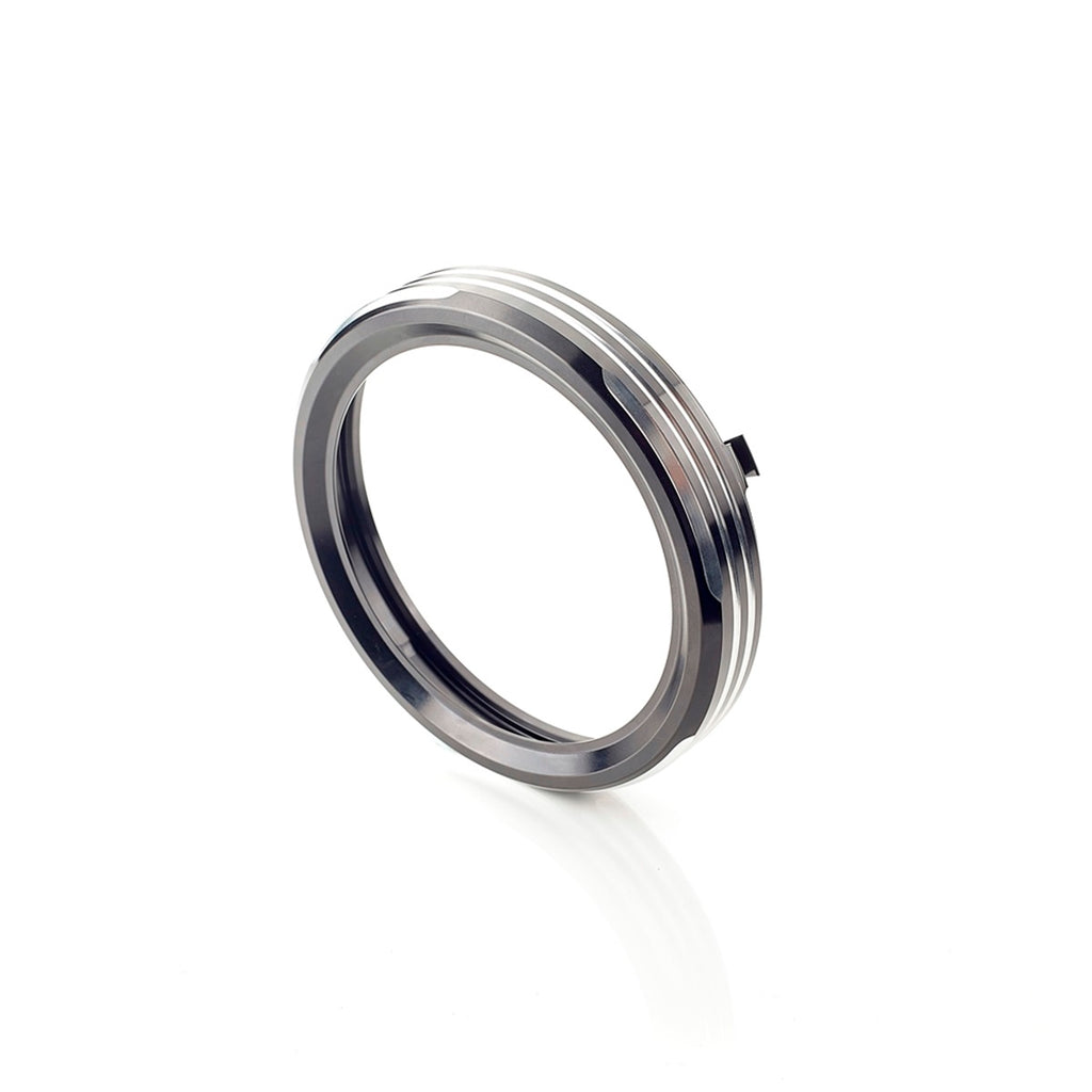 A fully machined aluminium headlight bezel with machined groove detailing anodized in black